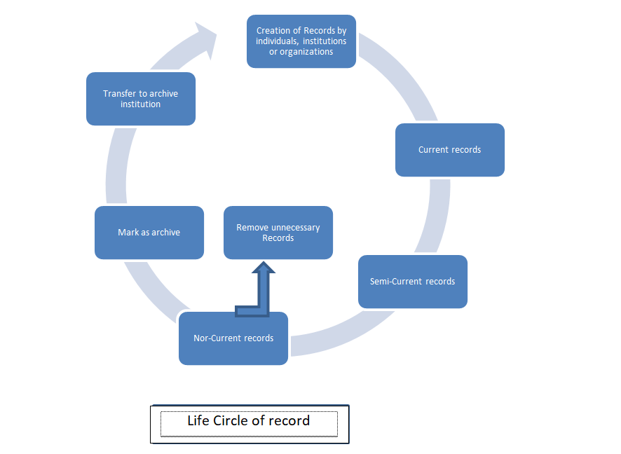 Just as every living thing has a life cycle, records also have a life cycle. A life cycle extends from birth to death. The life cycle of a record basically starts from the creation of the record to its transfer to an archival institution. A record ends with its creation, use, identification as archives, and finally surrender to an archival institution. Unnecessary records end with destruction.